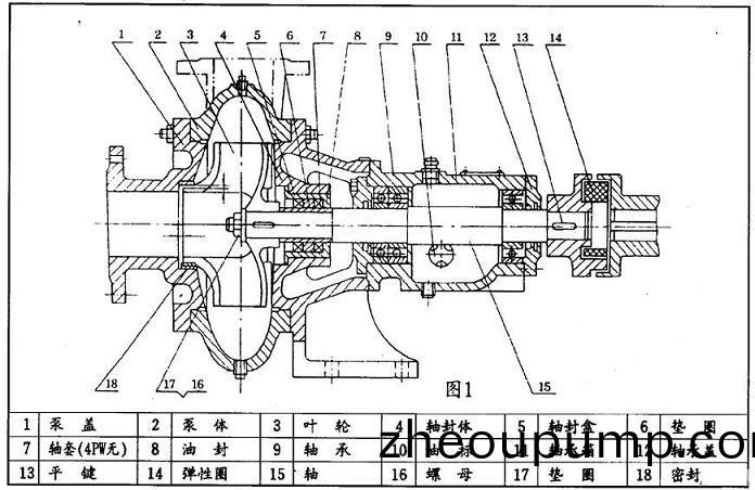 本型泵主要(yao)由(you):泵蓋(1),泵(beng)體(2),葉(ye)輪(3),軸(15),軸(zhou)封體(4),軸承(cheng)箱(11))及(ji)聯(lian)軸器部(bu)件(jian)等組(zu)成〈見圖(tu)1:結(jie)構圖(tu)〉